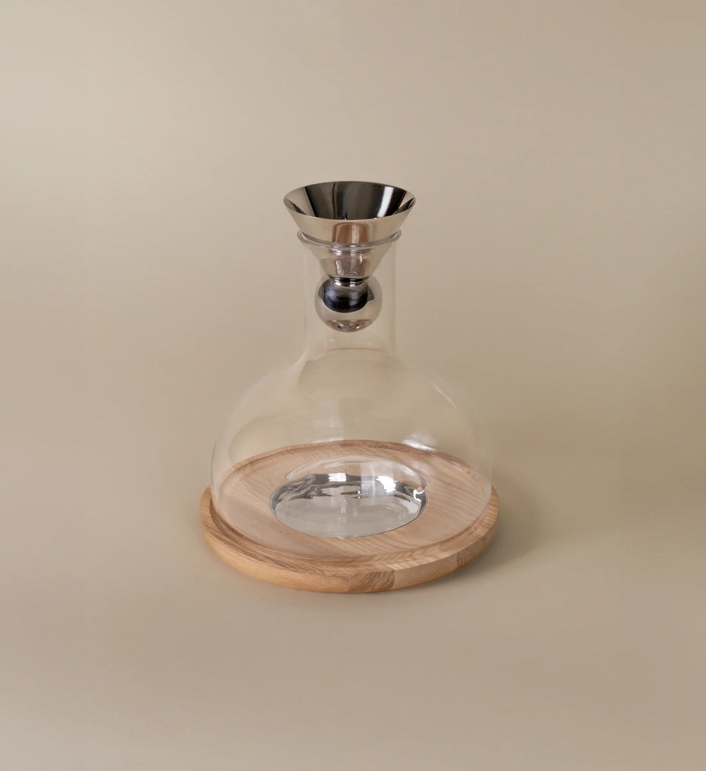 As beautiful as it is functional, our Birdie Wine Decanter aerates wine to enhance the aroma and flavor. Wine thinly cascades down the aerating sphere, exposing the maximum surface area of the wine to the air while creating an unexpected and captivating display. Made of hand-blown glass, our Birdie Wine Decanter features a generously sized base that rests on a minimalist ash wood trivet to protect surfaces. To serve, remove the aerator, place it on the included metal coaster, and enjoy.