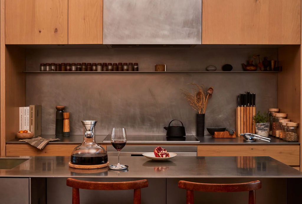 Ash wood trivet and removable metal coaster protect surfaces when serving.
