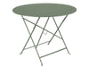 The 24" round folding Bistro Table is made of lacquered steel and has no parasol hole. The table was created in the 19th century in Europe and has found its way to the US. Seats two to three people for drinks.