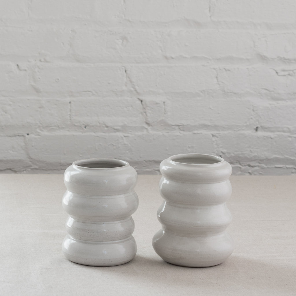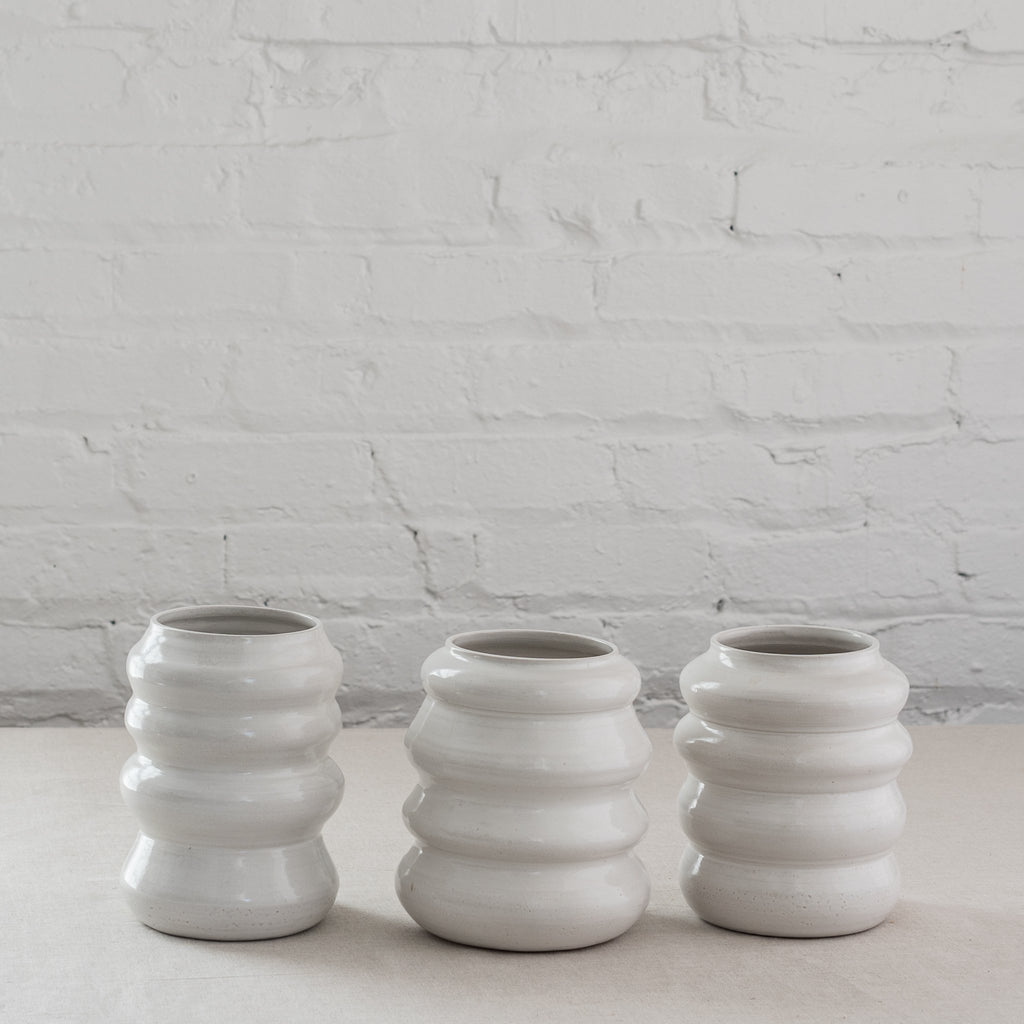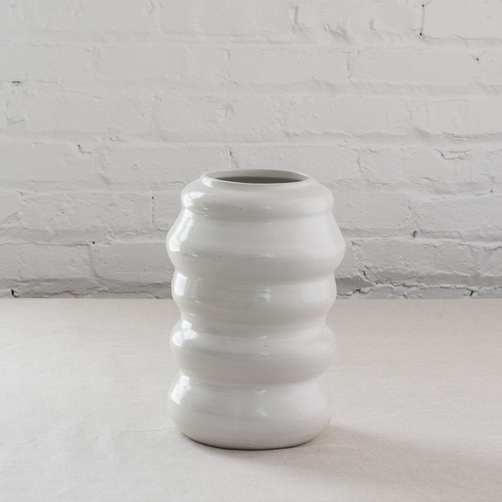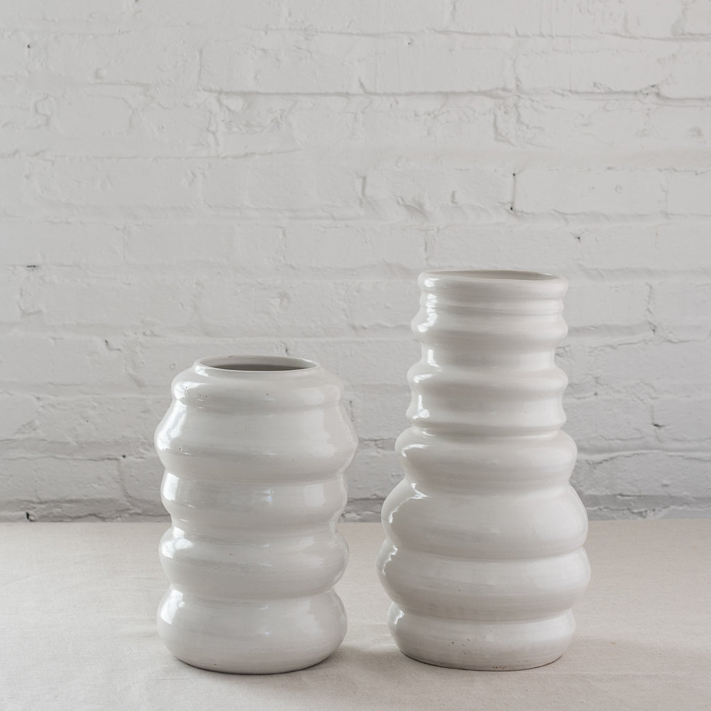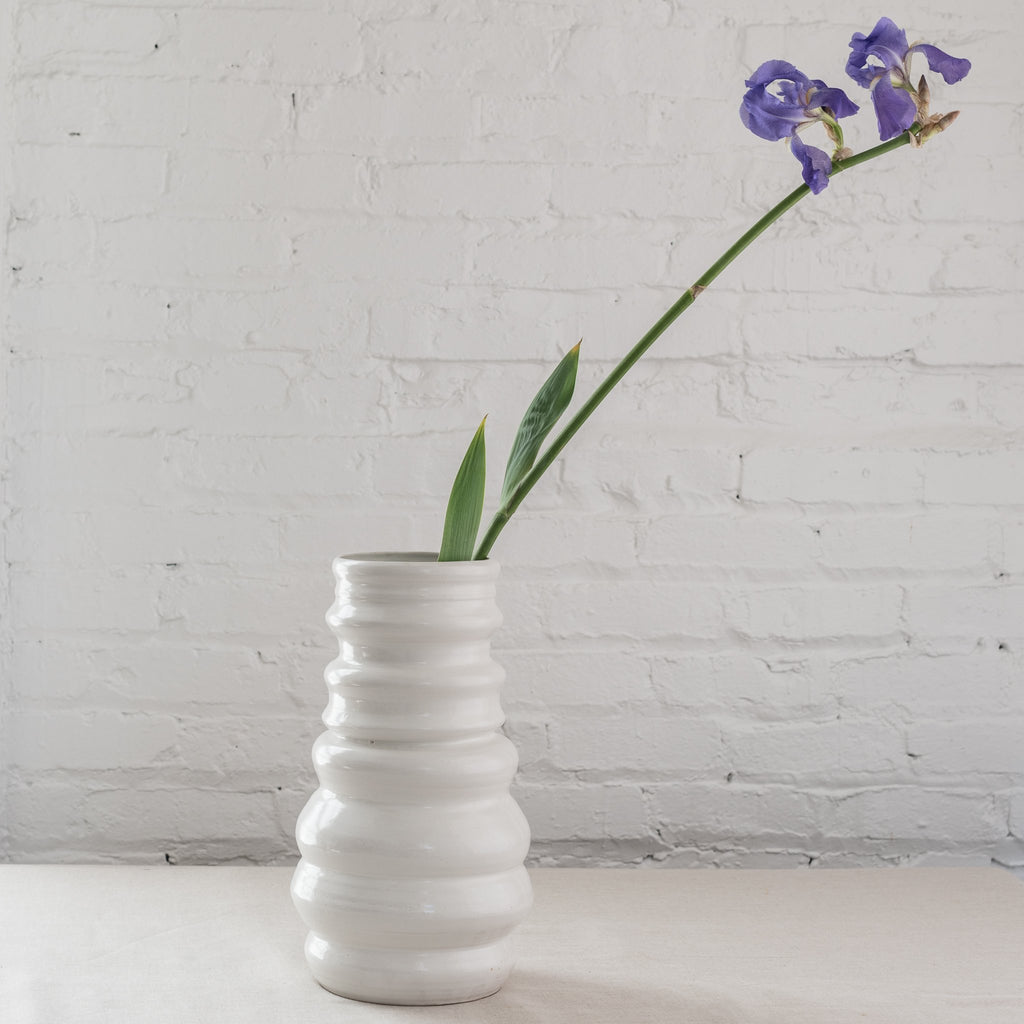Make a statement with or without the flowers. Crafted exclusively for us, our modern vases featured a series of sturdy rings spun together to form a one-of-a-kind shape that feels as good as it looks. Available in glossy white or navy. Each piece is unique and size varies.