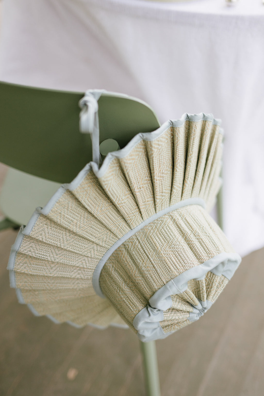 Sea Foam features sea-foam-green colored thread woven in a geometric pattern, through its natural fibre base, with sea-foam-green colored fabric trimming.