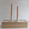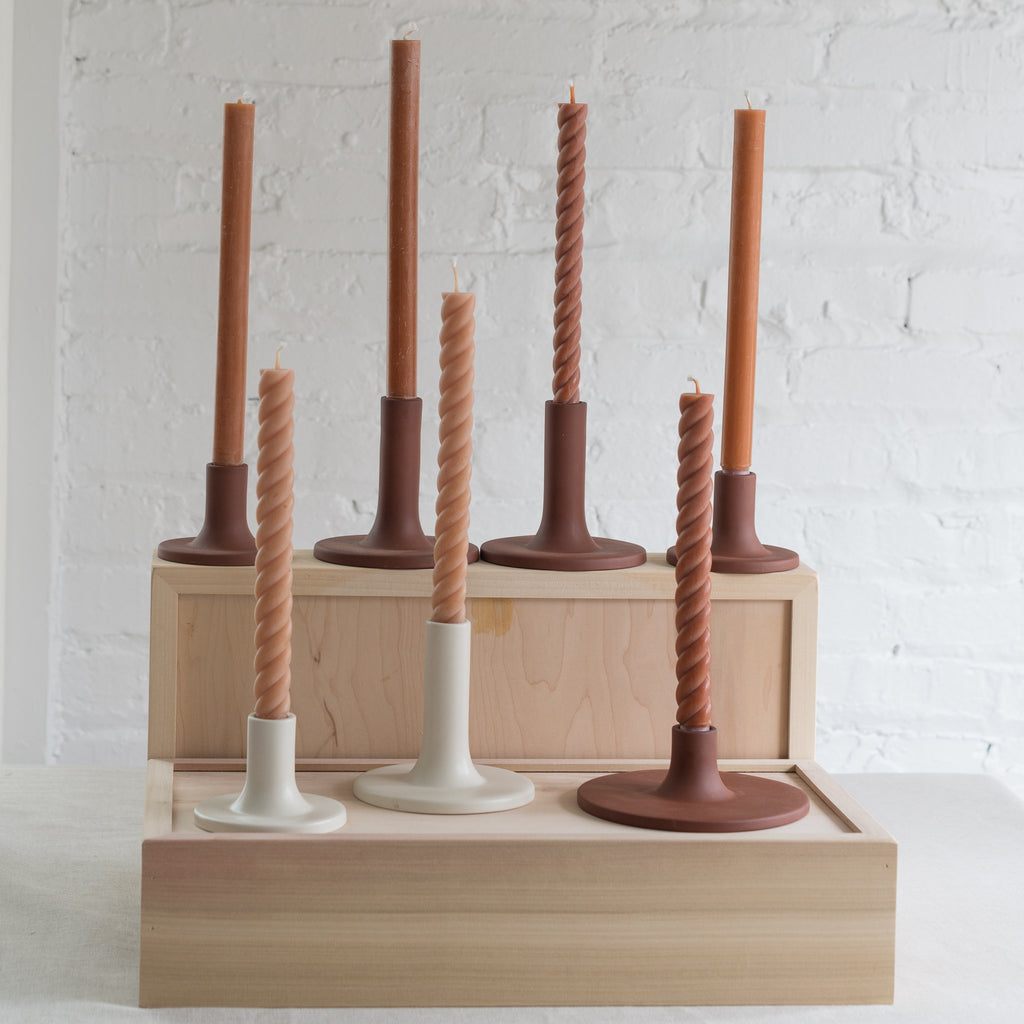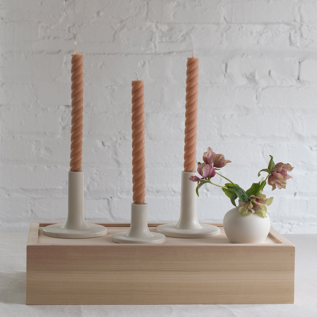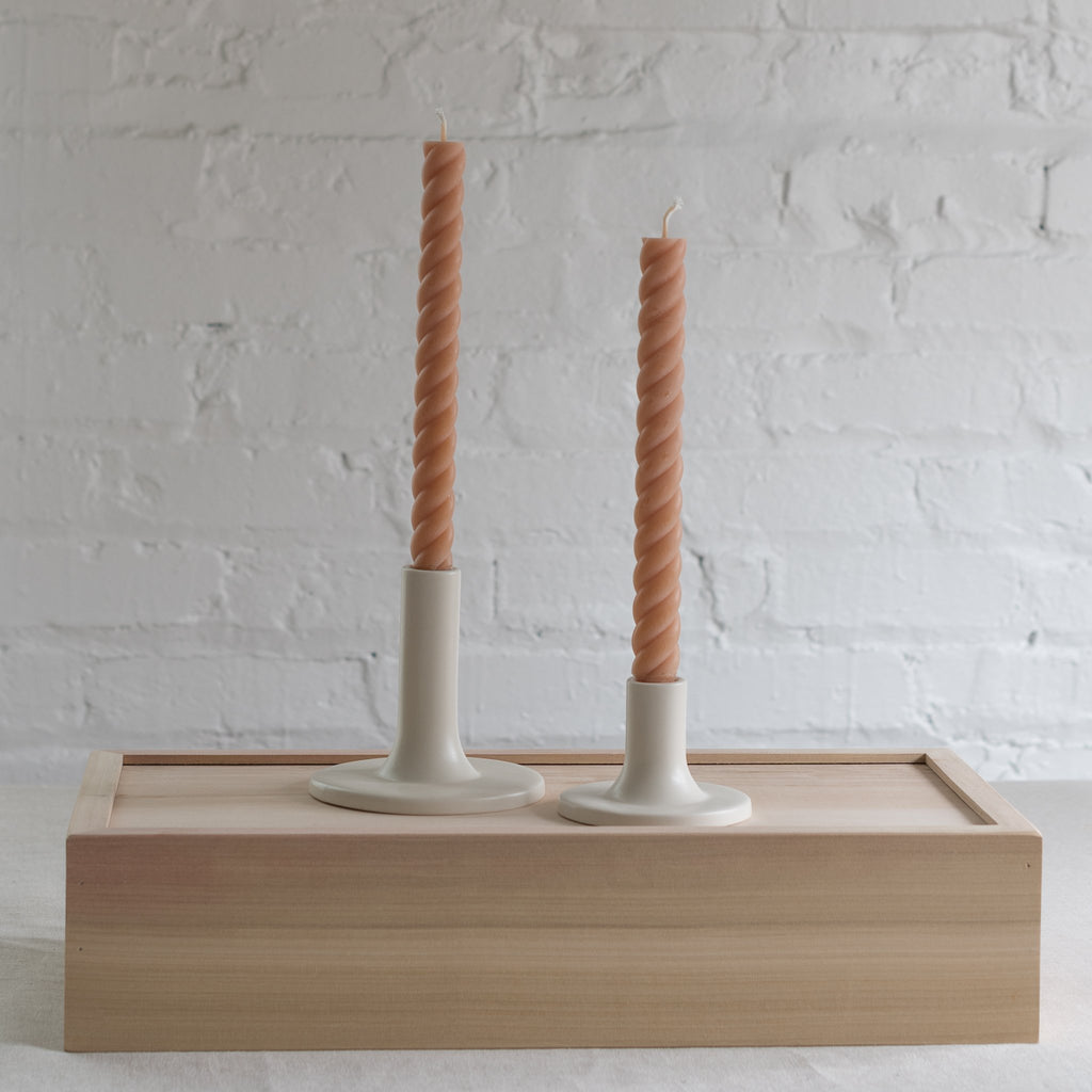 Our ceramic taper holders offer a fresh variation in shape and size and boast a clean, matte-speckled sand finish. With stand-alone appeal, they also feel dynamic as a collection. Each holder is sized to fit a standard taper candle.